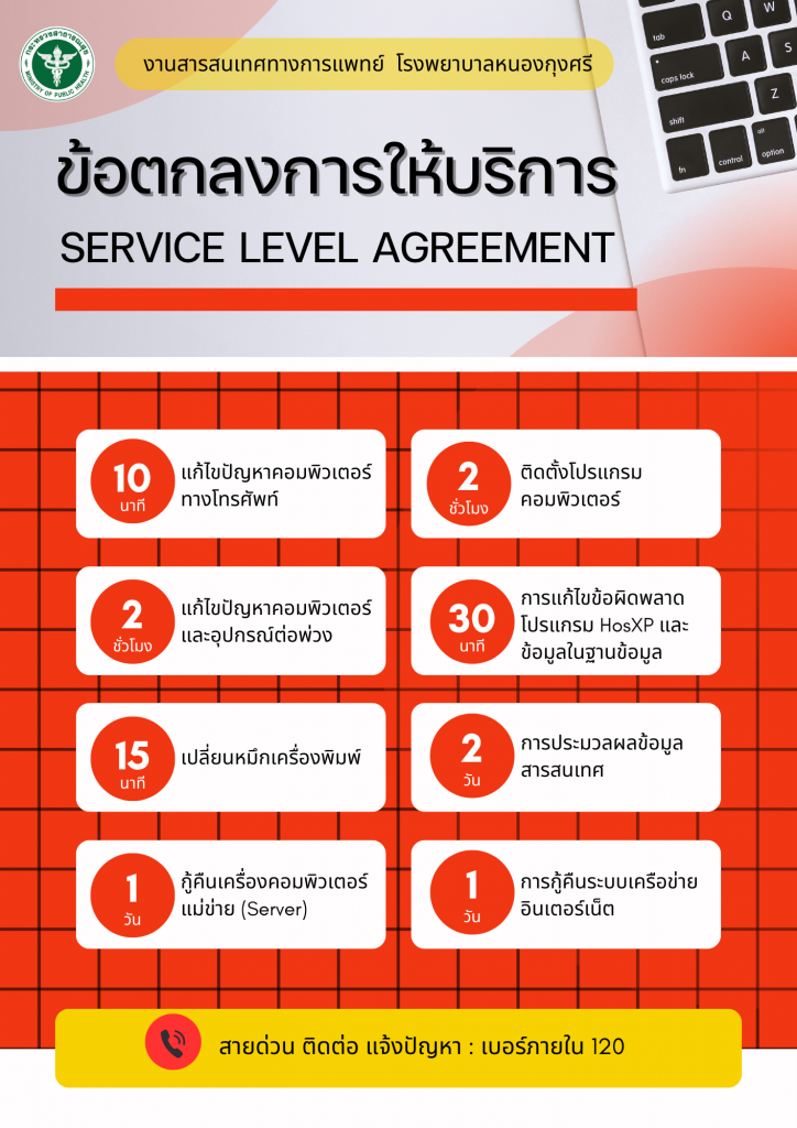 ตามที่โรงพยาบาลหนองกุงศรี ได้ดำเนินโครงการพัฒนาคุณภาพระบบเทคโนโลยีสารสนเทศโรงพยาบาล (HAIT) ซึ่งในหัวข้อการจัดการระบบบริการเทคโนโลยีสารสนเทศโรงพยาบาล (Service Management in Hospital information System) จะต้องมีข้อตกลงระดับบริการ (Service Level Agreement) ซึ่งจะทำให้ผู้ใช้งานระบบเทคโนโลยีสารสนเทศของโรงพยาบาลทำงานได้อย่างต่อเนื่อง และรับประกันว่าจะได้รับการสนับสนุนจากงานสารสนเทศทางการแพทย์ ในการซ่อมบำรุงและแก้ไขปัญหาภายในระยะเวลาที่ตกลงไว้ร่วมกัน ทางงานสารสนเทศทางการแพทย์ได้จัดทำแนวทางการให้บริการด้านสารสนเทศ (Service Level Agreement) สำหรับบริการบุคลากรภายในโรงพยาบาลหนองกุงศรี เพื่อให้เป็นไปตามมาตรฐานการพัฒนาคุณภาพของระบบสารสนเทศโรงพยาบาล รายละเอียดดังนี้