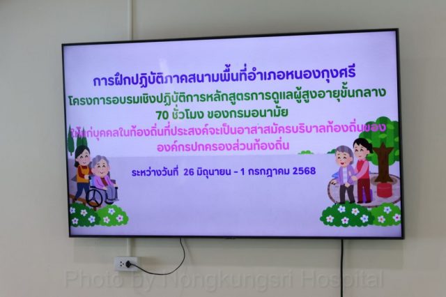 วันที่ 26 มิถุนายน 2568 เวลา 09.00 น. นายแพทย์สัญญา สุปัญญาบุตร ผู้อำนวยการโรงพยาบาลหนองกุงศรี เป็นประธานเปิดการฝึกปฏิบัติภาคสนามพื้นที่อำเภอหนองกุงศรี โครงการ อบรมเชิงปฏิบัติการหลักสูตรการดูแลผู้สูงอายุขั้นกลาง 70 ชั่วโมง ของกรมอนามัยให้แก่บุคคลในท้องถิ่นที่ประสงค์จะเป็นอาสาสมัครบริบาลท้องถิ่นขององค์กรปกครองส่วนท้องถิ่น ระหว่างวันที่ 26 มิถุนายน - 1 กรกฏาคม 2568 โดยมี นางอารี ปังสี ท้องถิ่นอำเภอหนองกุงศรี เป็นผู้กล่าวรายงาน มีเนื้อหาการประชุม เช่น การดูแลผู้ป่วยด้วยหัวใจความเป็นมนุษย์ การดูแลผู้ป่วยประคับประคองในพื้นที่ และการพยาบาลผู้ป่วยข้างเตียง ในโรงพยาบาลเพื่อส่งต่อการดูแลต่อเนื่องในชุมชนเป็นต้น โดยมีผู้เข้าอบรมจำนวน 12 คน ณ ห้องประชุมอำเภอหนองกุงศรี อำเภอหนองกุงศรี จังหวัดกาฬสินธุ์