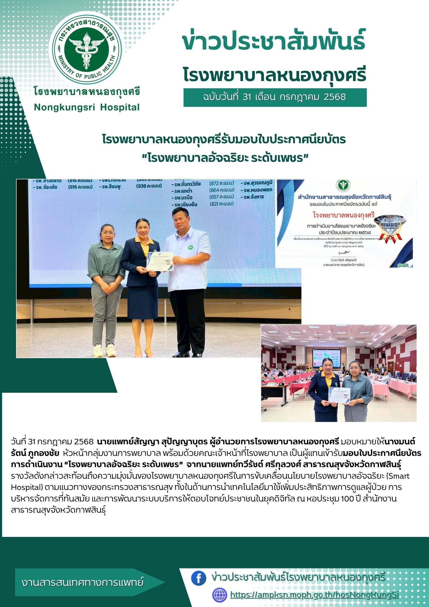 วันที่ 31 กรกฎาคม 2568 โรงพยาบาลหนองกุงศรีได้รับเกียรติรับมอบใบประกาศนียบัตรการดำเนินงาน “โรงพยาบาลอัจฉริยะ ระดับเพชร” โดยนายแพทย์สัญญา สุปัญญาบุตร ผู้อำนวยการโรงพยาบาลหนองกุงศรี มอบหมายให้นางมนต์รัตน์ ภูกองชัย หัวหน้ากลุ่มงานการพยาบาล พร้อมด้วยคณะเจ้าหน้าที่โรงพยาบาล เป็นผู้แทนเข้ารับมอบจากนายแพทย์ทวีรัชต์ ศรีกุลวงศ์ สาธารณสุขจังหวัดกาฬสินธุ์ รางวัลดังกล่าวสะท้อนถึงความมุ่งมั่นของโรงพยาบาลหนองกุงศรีในการขับเคลื่อนนโยบายโรงพยาบาลอัจฉริยะ (Smart Hospital) ตามแนวทางของกระทรวงสาธารณสุข ทั้งในด้านการนำเทคโนโลยีมาใช้เพิ่มประสิทธิภาพการดูแลผู้ป่วย การบริหารจัดการที่ทันสมัย และการพัฒนาระบบบริการให้ตอบโจทย์ประชาชนในยุคดิจิทัล ณ หอประชุม 100 ปี สำนักงานสาธารณสุขจังหวัดกาฬสินธุ์