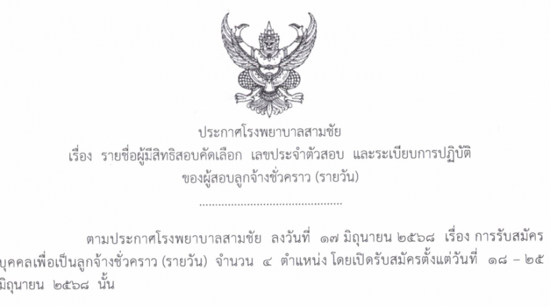 รับสมัครบุคคลเพื่อสอบคัดเลือกเป็นลูกจ้างชั่วคราว (รายวัน) จำนวน 4 ตำแหน่ง ดังนี้1.พยาบาลวิชาชีพ จำนวน 3 อัตรา2.พนักงานช่วนเหลือคนไข้ จำนวน 1 อัตรา3.พนักงานบริการ (แม่บ้าน) จำนวน 1 อัตรา4.พนักงานเปล จำนวน 1 อัตรา รับสมัครตั้งแต่วันที่