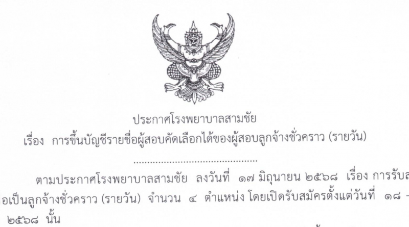 Read Moreประกาศโรงพยาบาลสามชัยเรื่อง การขึ้นบัญชีรายชื่อผู้สอบคัดเลือกได้ของผู้สอบลูกจ้างชั่วคราว (รายวัน) ตามประกาศโรงพยาบาลสามชัย ลงวันที่ ๘ ตุลาคม ๒๕๖๗ เรื่อง การรับสมัครบุคคลเพื่อเป็นลูกจ้างชั่วคราว (รายวัน) จํานวน ๑๐ ตําแหน่ง โดยเปิดรับสมัครตั้งแต่วันที่ ๙ – ๒๕ ตุลาคม๒๕๖๗ บัดนี้