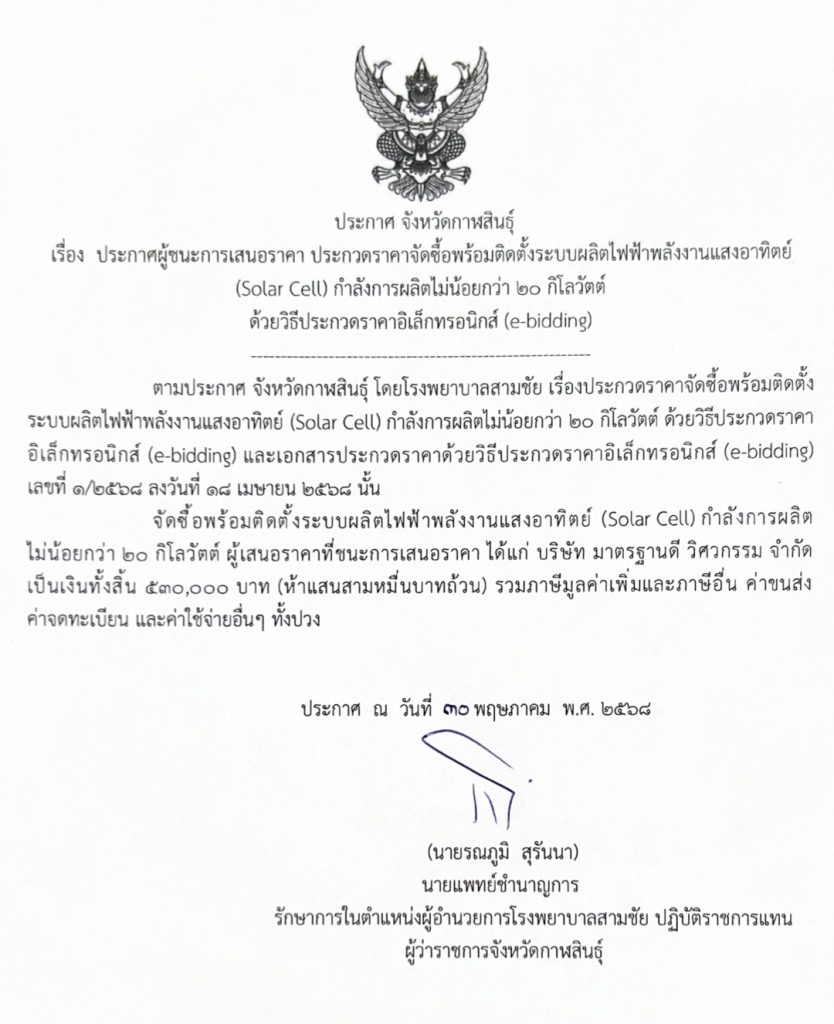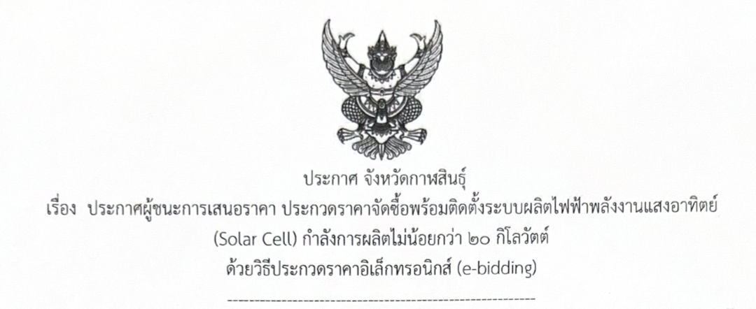 ประกาศผู้ชนะการเสนอราคา ประกวคราคาจัตสอตร้อมติต์้ระบบผลิศไฟฟ่าหลังานเสงอาศิต์ (Solar Cell) กําลังการผลิตไม่น้อยกว่า ๒๐ กิโลวัตต์ ด้วยวิธีประกวดราคาอิเล็กทรอนิกส์ (e-bidding)