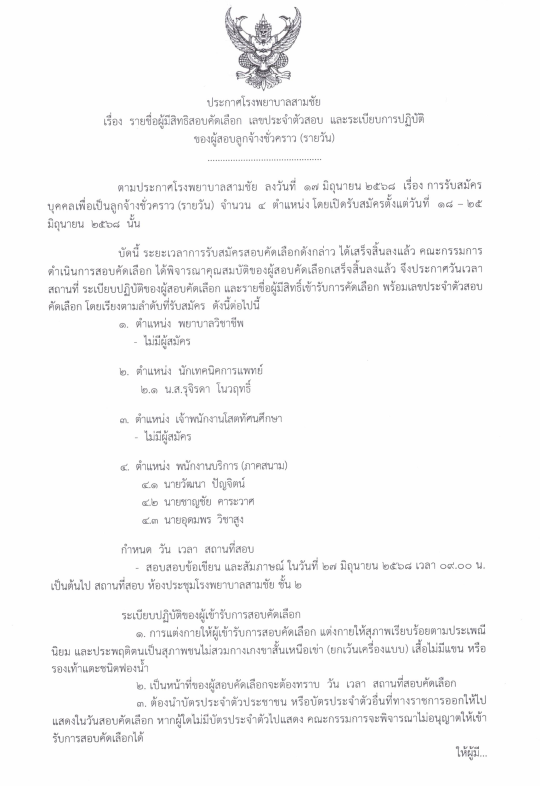 ตามประกาศโรงพยาบาลสามชัย ลงวันที่ 17 นิถุนายน ๒๕๖๘ เรื่อง การรับสมัคร