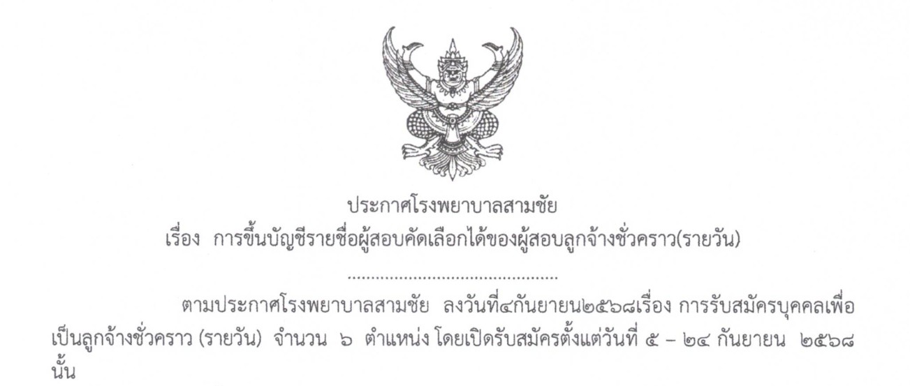 ประกาศโรงพยาบาลสามชัยเรือง การขึ้นบัญชีรายชื่อผู้สอบคัดเลือกได้ของผู้สอบลูกจ้างชั่วคราว(รายวัน)