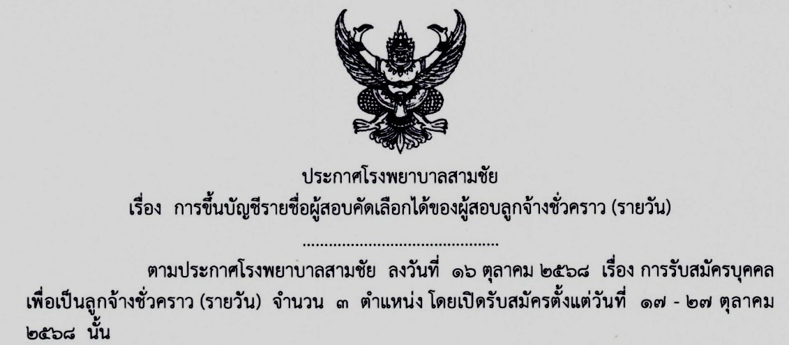 ข่าวสมัครงาน ประกาศโรงพยาบาลสามชัย เรื่อง การขึ้นบัญชีรายชื่อผู้สอบคัดเลือกได้ของผู้สอบลูกจ้างชั่วคราว (รายวัน) November 1, 2025 IT-28791