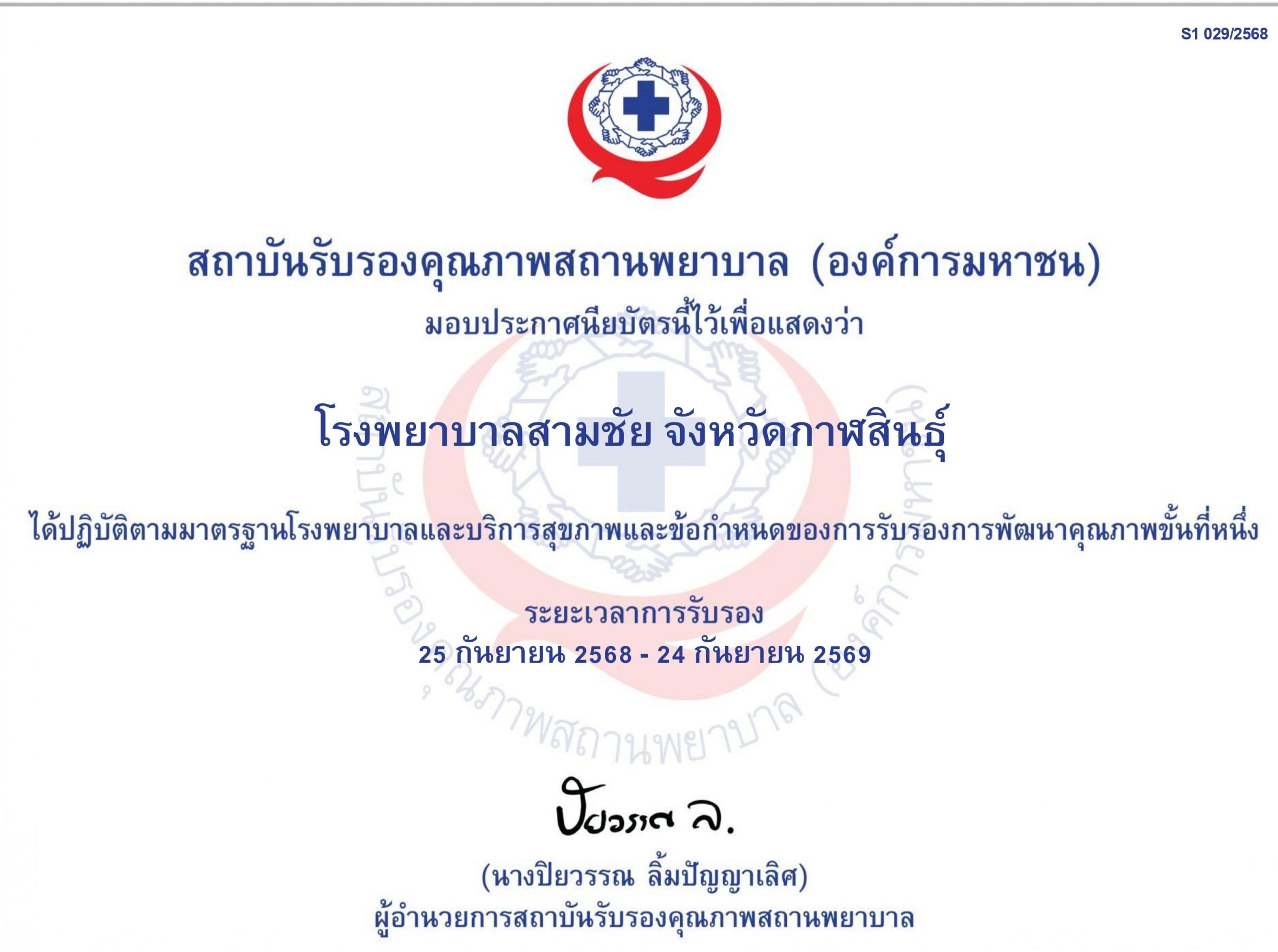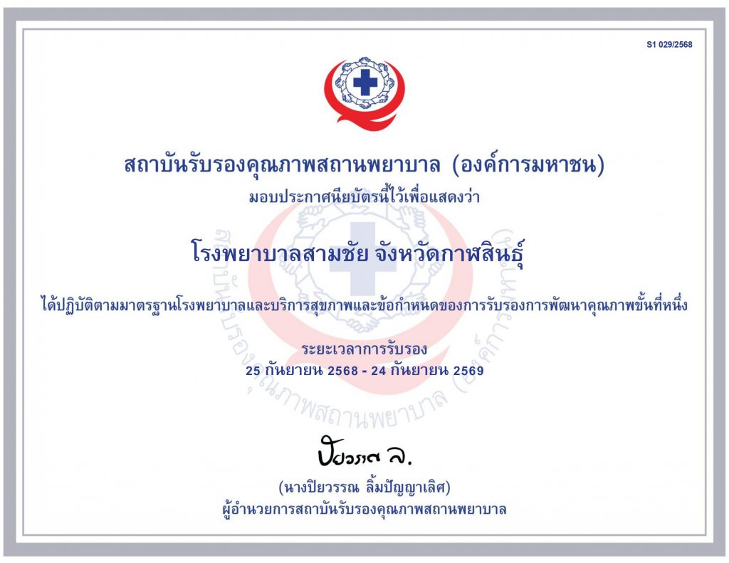 ประกาศโรงพยาบาลสามชัย สถาบันรับรองคุณภาพสถานพยาบาล (องค์การมหาชน)มอบประกาศนียบัตรนี้ไว้เพื่อแสดงว่าโรงพยาบาลสามชัย จังหวัดกาฬสินธ์ได้ปฏิบัติตามมาตรฐานโรงพยาบาลและบริการสุขภาพและข้อกำหนดของการรับรองการพัฒนาคุณภาพขั้นที่หนึ่งระยะเวลาการรับรอง 25 กันยายน 2568 – 24 กันยายน 2569