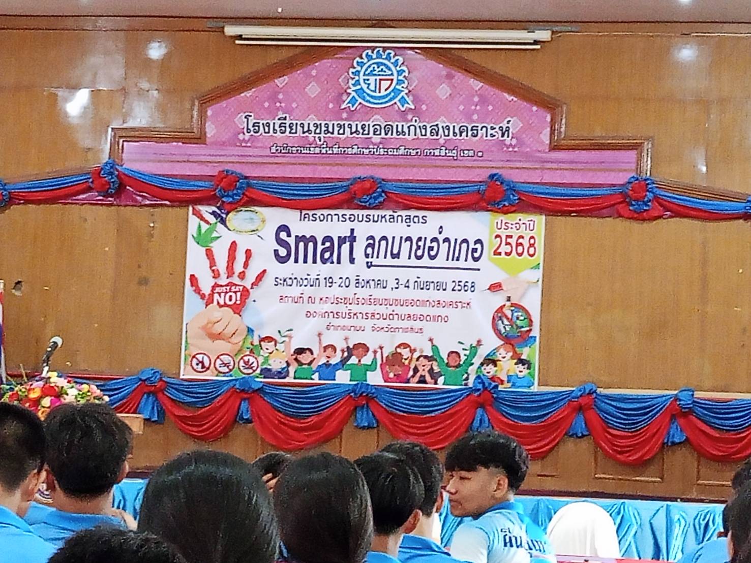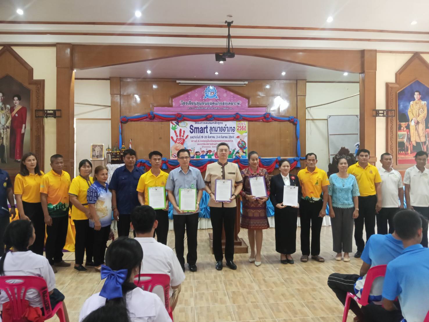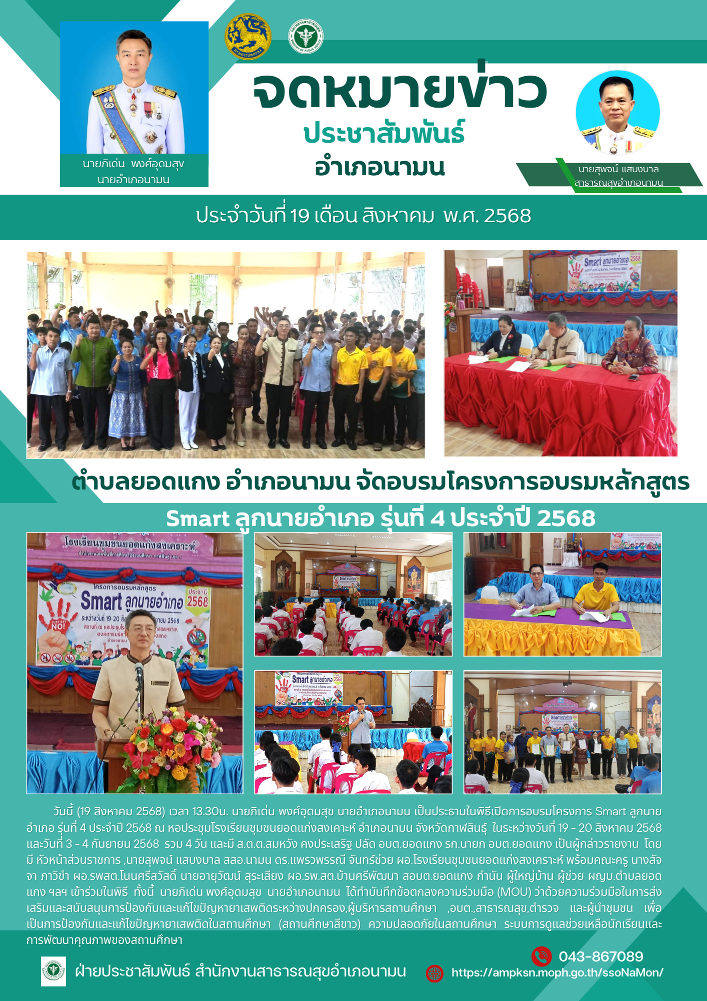 วันนี้ (19 สิงหาคม 2568) เวลา 13.30น. นายภิเด่น พงศ์อุดมสุข นายอำเภอนามน เป็นประธานในพิธีเปิดการอบรมโครงการ Smart ลูกนายอำเภอ รุ่นที่ 4 ประจำปี 2568 ณ หอประชุมโรงเรียนชุมชนยอดแก่งสงเคาะห์ อำเภอนามน จังหวัดกาฬสินธุ์ ในระหว่างวันที่ 19 – 20 สิงหาคม 2568 และวันที่ 3 – 4 กันยายน 2568 รวม 4 วัน และมี ส.ต.ต.สมหวัง คงประเสริฐ ปลัด อบต.ยอดแกง รก.นายก อบต.ยอดแกง เป็นผู้กล่าวรายงาน โดยมี หัวหน้าส่วนราชการ ,นายสุพจน์ แสบงบาล สสอ.นามน ดร.แพรวพรรณี จันทร์ช่วย ผอ.โรงเรียนชุมชนยอดแก่งสงเคราะห์ พร้อมคณะครู นางสัจจา ภาวิขำ ผอ.รพสต.โนนศรีสวัสดิ์ นายอายุวัฒน์ สุระเสียง ผอ.รพ.สต.บ้านศรีพัฒนา สอบต.ยอดแกง กำนัน ผู้ใหญ่บ้าน ผู้ช่วย ผญบ.ตำบลยอดแกง ฯลฯ เข้าร่วมในพิธี ทั้งนี้ นายภิเด่น พงศ์อุดมสุข นายอำเภอนามน ได้ทำบันทึกข้อตกลงความร่วมมือ (MOU) ว่าด้วยความร่วมมือในการส่งเสริมและสนับสนุนการป้องกันและแก้ไขปัญหายาเสพติดระหว่างปกครอง,ผู้บริหารสถานศึกษา ,อบต.,สาธารณสุข,ตำรวจ และผู้นำชุมชน เพื่อเป็นการป้องกันและแก้ไขปัญหายาเสพติดในสถานศึกษา (สถานศึกษาสีขาว) ความปลอดภัยในสถานศึกษา ระบบการดูแลช่วยเหลือนักเรียนและการพัฒนาคุณภาพของสถานศึกษา ในดำเนินการอบรมโครงการ Smart ลูกนายอำเภอ ให้ความรู้แก่นักเรียนผู้เข้าร่วม ในโครงการ 2 โรงเรียน ประกอบด้วยโรงเรียนชุมชนยอดแก่งสงเคราะห์ 46 ราย และโรงเรียนหนองหญ้าปล้อง 30 ราย ในการนี้ได้ให้ความรู้เกี่ยวกับโทษของสารเสพติดในรูปแบบต่างๆ แก่เด็กนักเรียนที่เข้าร่วมการอบรม โดยได้รับงบประมาณสนับสนุนในการจัดอบรมครั้งนี้ จากองค์การบริหารส่วนตำบลยอดแกง