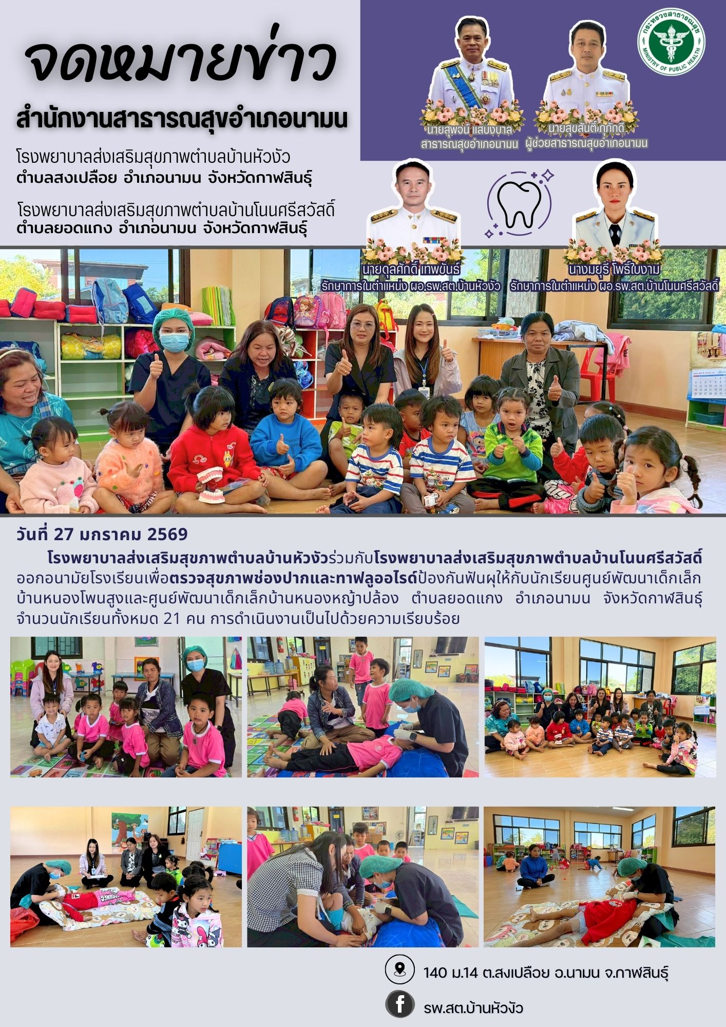 - โรงพยาบาลส่งเสริมสุขภาพตำบลบ้านหัวงัวร่วมกับโรงพยาบาลส่งเสริมสุขภาพตำบลบ้านโนนศรีสวัสดิ์ ออกอนามัยโรงเรียนเพื่อตรวจสุขภาพช่องปากและทาฟลูออไรด์ป้องกันฟันผุให้กับนักเรียนศูนย์พัฒนาเด็กเล็กบ้านหนองโพนสูงและศูนย์พัฒนาเด็กเล็กบ้านหนองหญ้าปล้อง ตำบลสงยอดแกง อำเภอนามน จังหวัดกาฬสินธุ์ จำนวนนักเรียนทั้งหมด 21 คน