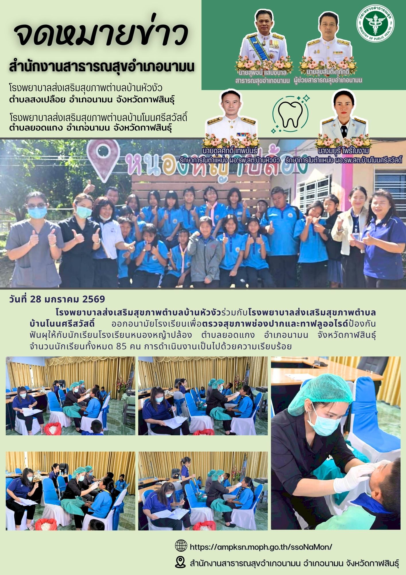 โรงพยาบาลส่งเสริมสุขภาพตำบลบ้านหัวงัว ร่วมกับโรงพยาบาลส่งเสริมสุขภาพตำบลบ้านโนนศรีสวัสดิ์ ออกอนามัยโรงเรียนเพื่อตรวจสุขภาพช่องปากและทาฟลูออไรด์ป้องกันฟันผุให้กับนักเรียนโรงเรียนหนองหญ้าปล้อง ตำบลสงยอดแกง อำเภอนามน จังหวัดกาฬสินธุ์ จำนวนนักเรียนทั้งหมด 85 คน การดำเนินงานเป็นไปด้วยความเรียบร้อย