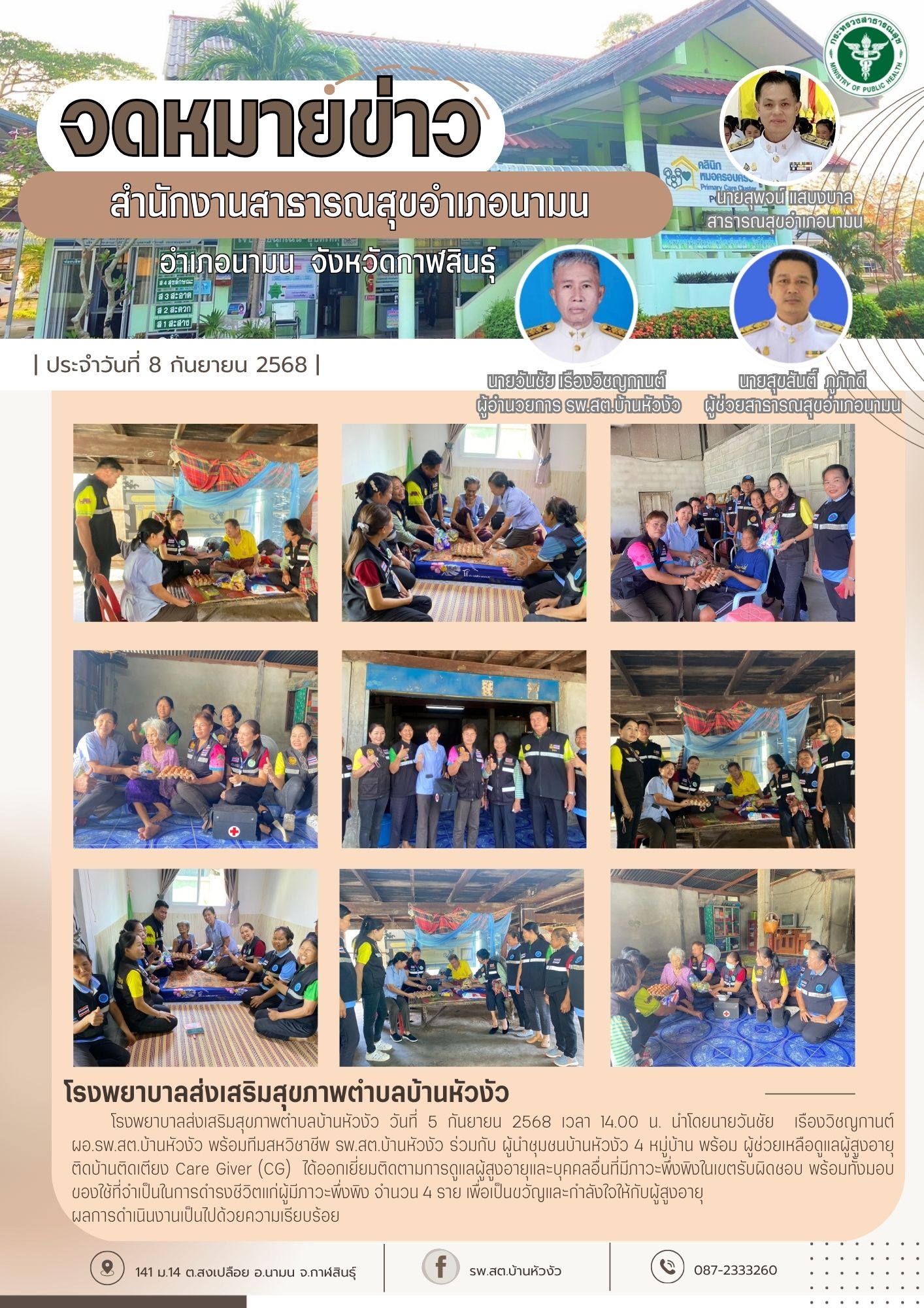 โรงพยาบาลส่งเสริมสุขภาพตำบลบ้านหัวงัว นำโดยนายวันชัย เรืองวิชญกานต์ ผอ.รพ.สต.บ้านหัวงัว พร้อมทีมสหวิชาชีพ รพ.สต.บ้านหัวงัว ร่วมกับ ผู้นำชุมชนบ้านหัวงัว 4 หมู่บ้าน พร้อม ผู้ช่วยเหลือดูแลผู้สูงอายุติดบ้านติดเตียง Care Giver (CG) ได้ออกเยี่ยมติดตามการดูแลผู้สูงอายุและบุคคลอื่นที่มีภาวะพึ่งพิงในเขตรับผิดชอบ พร้อมทั้งมอบของใช้ที่จำเป็นในการดำรงชีวิตแก่ผู้มีภาวะพึ่งพิง จำนวน 4 ราย เพื่อเป็นขวัญและกำลังใจให้กับผู้สูงอายุ
