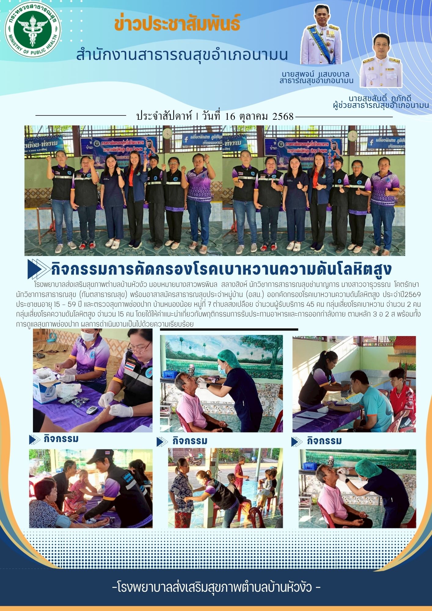 โรงพยาบาลส่งเสริมสุขภาพตำบลบ้านหัวงัว มอบหมายนางสาวพรพิมล สลางสิงห์ นักวิชาการสาธารณสุขชำนาญการ นางสาวจารุวรรณ โคตรักษา นักวิชาการสาธารณสุข (ทันตสาธารณสุข) พร้อมอาสาสมัครสาธารณสุขประจำหมู่บ้าน (อสม.) ออกคัดกรองโรคเบาหวานความดันโลหิตสูง ประจำปี2569 ประชาชนอายุ 15 – 59 ปี และตรวจสุขภาพช่องปาก บ้านหนองน้อย หมู่ที่ 7 ตำบลสงเปลือย จำนวนผู้รับบริการ 45 คน กลุ่มเสี่ยงโรคเบาหวาน จำนวน 2 คน กลุ่มเสี่ยงโรคความดันโลหิตสูง จำนวน 15 คน โดยได้ให้คำแนะนำเกี่ยวกับพฤติกรรมการรับประทานอาหารและการออกกำลังกาย ตามหลัก 3 อ 2 ส พร้อมทั้งการดูแลสุขภาพช่องปาก  ผลการดำเนินงานเป็นไปด้วยความเรียบร้อย