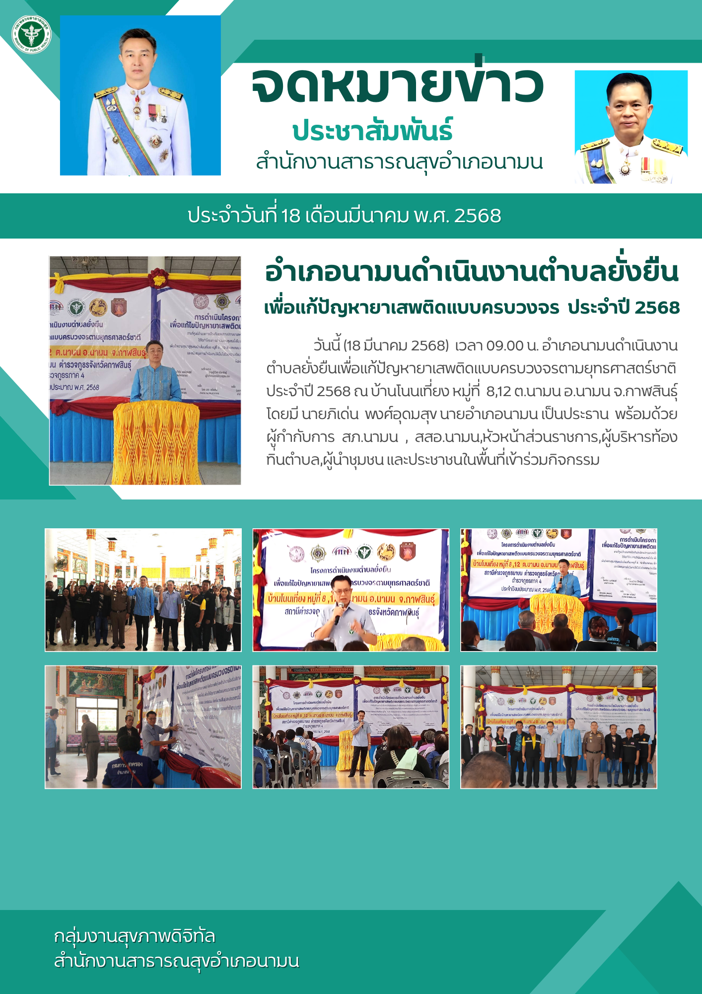 วันนี้ (18 มีนาคม 2568) เวลา 09.00 น. อำเภอนามนดำเนินงานตำบลยั่งยืนเพื่อแก้ปัญหายาเสพติดแบบครบวงจรตามยุทธศาสตร์ชาติ ประจำปี 2568 ณ บ้านโนนเที่ยง หมู่ที่ 8,12 ต.นามน อ.นามน จ.กาฬสินธุ์ โดยมี นายภิเด่น พงศ์อุดมสุข นายอำเภอนามน เป็นประธาน พร้อมด้วย ผู้กำกับการ สภ.นามน , สสอ.นามน,หัวหน้าส่วนราชการ,ผู้บริหารท้องทิ่นตำบล,ผู้นำชุมชน และประชาชนในพื้นที่เข้าร่วมกิจกรรม