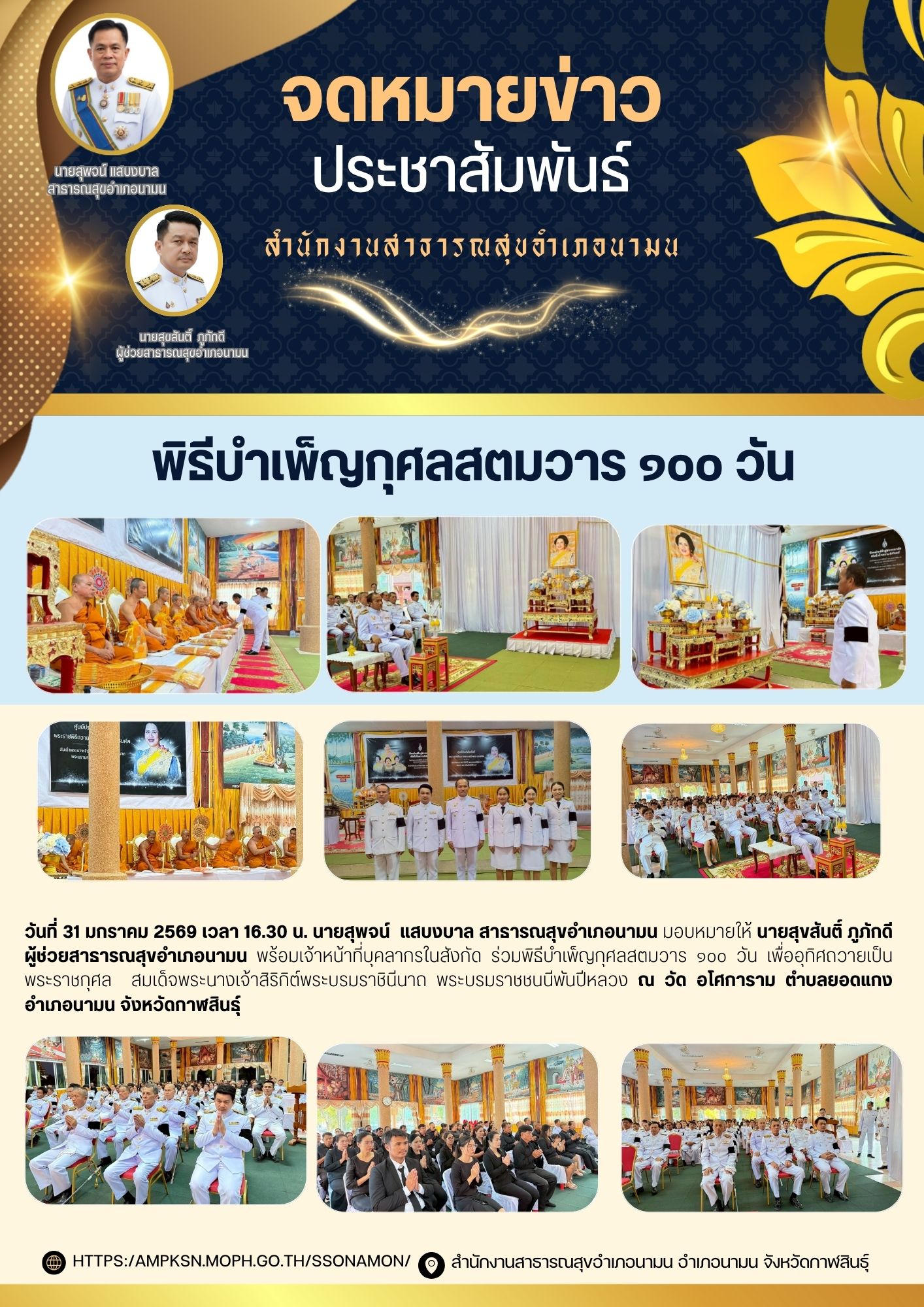 เวลา 16:30 น. อำเภอนามน ร่วมกับ คณะสงฆ์อำเภอนามน จัดพิธีบำเพ็ญกุศล สตมวาร 100 วัน เพื่ออุทิศถวายเป็นพระราชกุศลแด่สมเด็จพระนางเจ้าสิริกิติ์ พระบรมราชินีนาถ พระบรมราชชนนีพันปีหลวง โดยมี พระครูวิบูลวุฒิกร เจ้าคณะอำเภอนามน (ม) เป็นประธานฝ่ายสงฆ์ นายบุญถิ่น ภิรมกิจ ปลัดอำเภอ(เจ้าพนักงานปกครองชำนาญการพิเศษ ) รักษาราชการแทน นายอำเภอนามน เป็นประธานฝ่ายฆราวาส พร้อมด้วย นายจักรกริช เจียมตัว ปลัดอำเภอ สมาชิกสภาองค์การบริหารส่วนจังหวัดกาฬสินธุ์ เขตอำเภอนามน หัวหน้าส่วนราชการ หัวหน้าหน่วยงานรัฐวิสาหกิจ ผู้บริหารสถานศึกษา ผู้บริหารองค์กรปกครองส่วนท้องถิ่น ข้าราชการ พนักงาน ลูกจ้าง กำนัน ผู้ใหญ่บ้าน ผู้ช่วยผู้ใหญ่บ้าน แพทย์ประจำตำบล สารวัตรกำนัน และพสกนิกรชาวอำเภอนามนร่วมพิธี ณ วัดอโศการาม หมู่ที่ 10 ตำบลยอดแกง อำเภอนามน จังหวัดกาฬสินธุ์